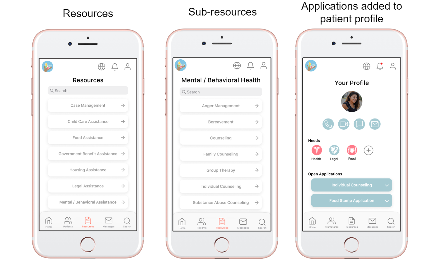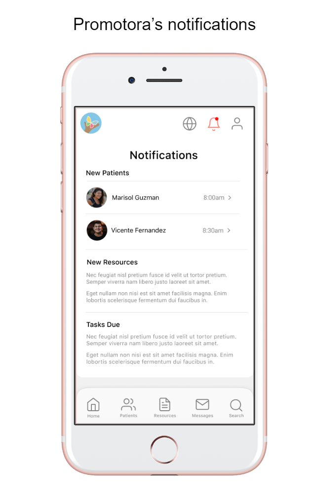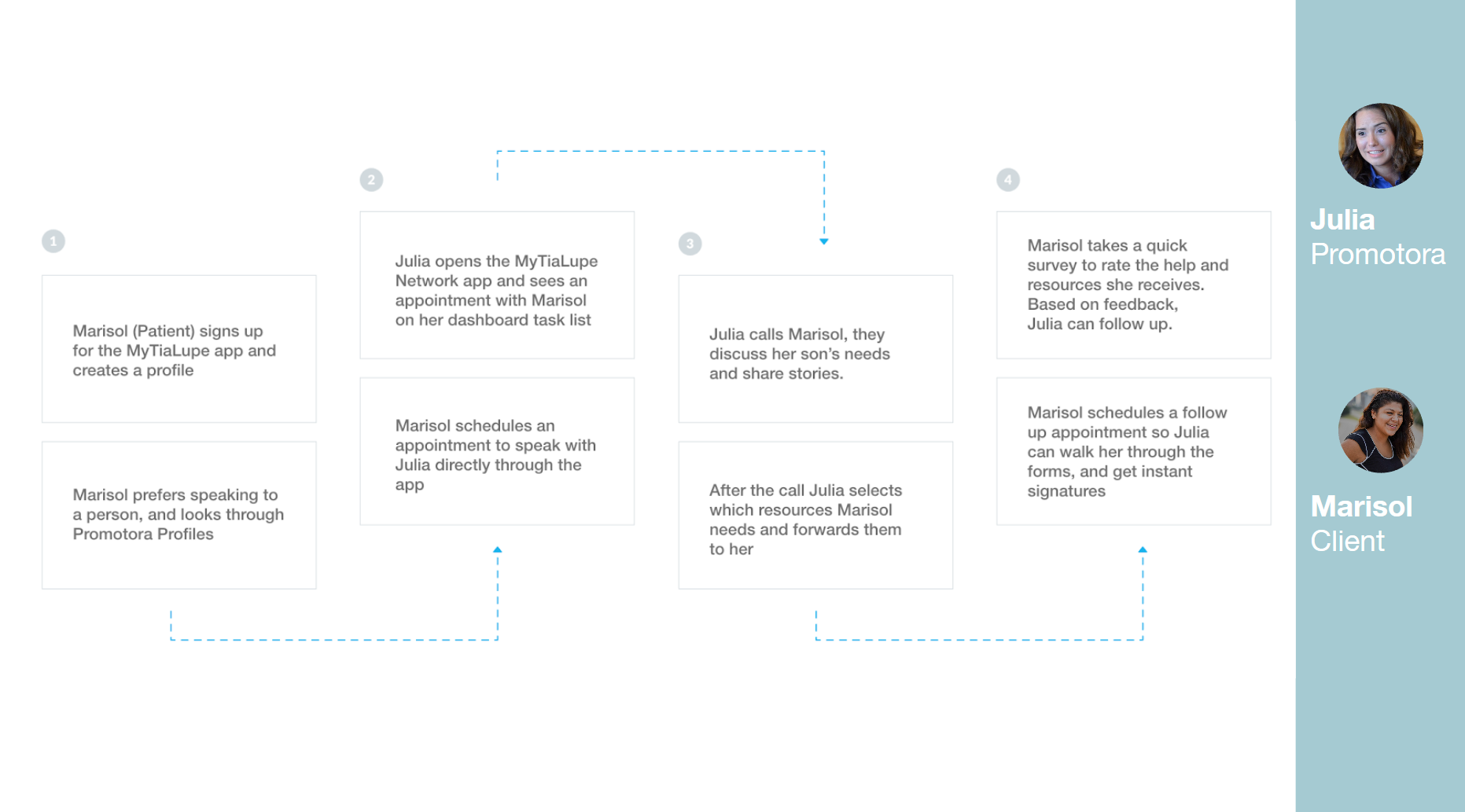 Mi Tia Lupe offers important features to help promotoras stay organized, carry out their daily tasks, keep on track with applications, make appointments online, and contact their clients via various channels. Our interviews, research, and user testing provided us with the necessary information about the features that promotoras would need to optimize their workflow by easily forwarding resources to their clients, have new resources added to the app automatically, keep in contact with their clients, help them out with applications, and more. More screens might be added at a later time for appointment cancellations and tasks page which would list all the tasks for the day, week, and month to help promotoras have that information on hand at all times.